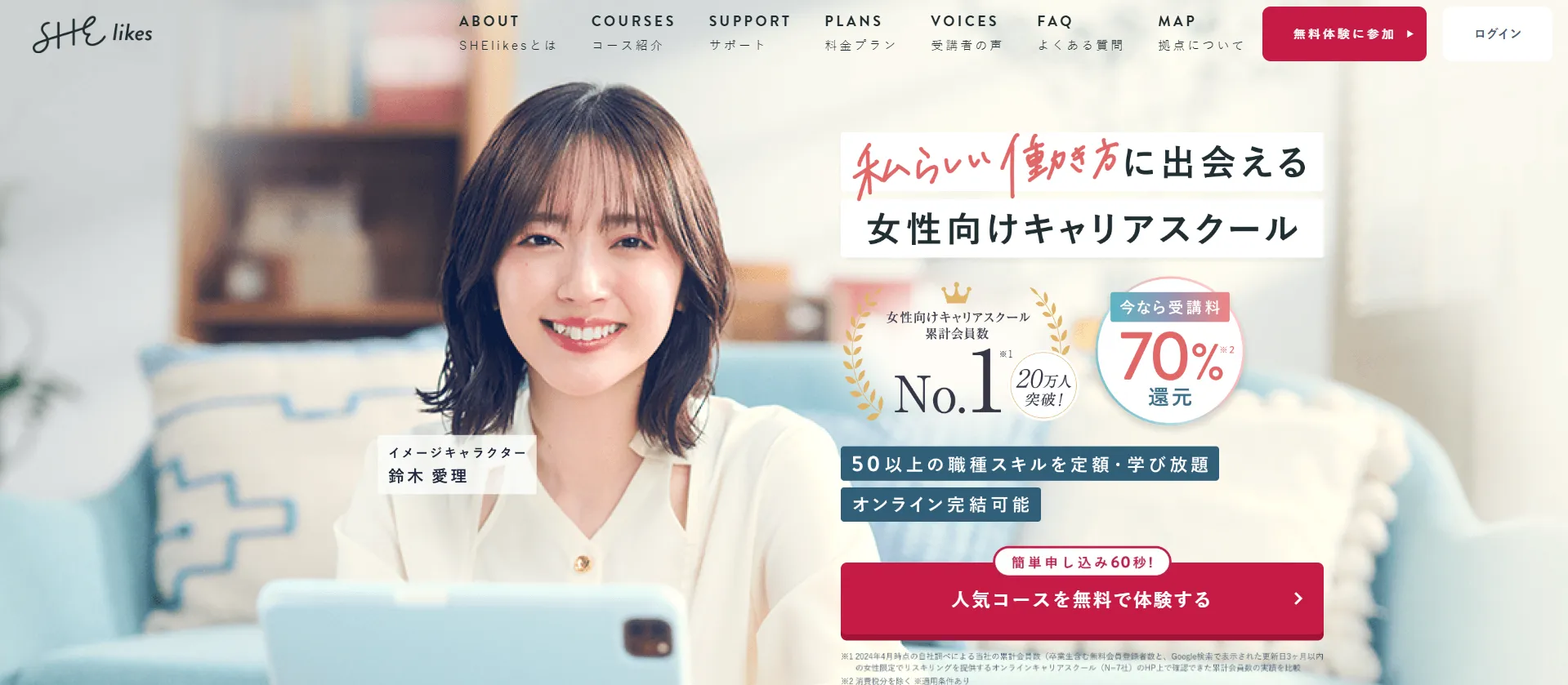 SHElikesオンラインレッスンにより変動あり(転職保証制度なし)・入学金:162,000円・レギュラープラン:352,000円(給付金活用可能)・スタンダードプラン:16,280円(月額)・50種類以上のレッスンが定額で学び放題・1年間の転職サポートを利用可能