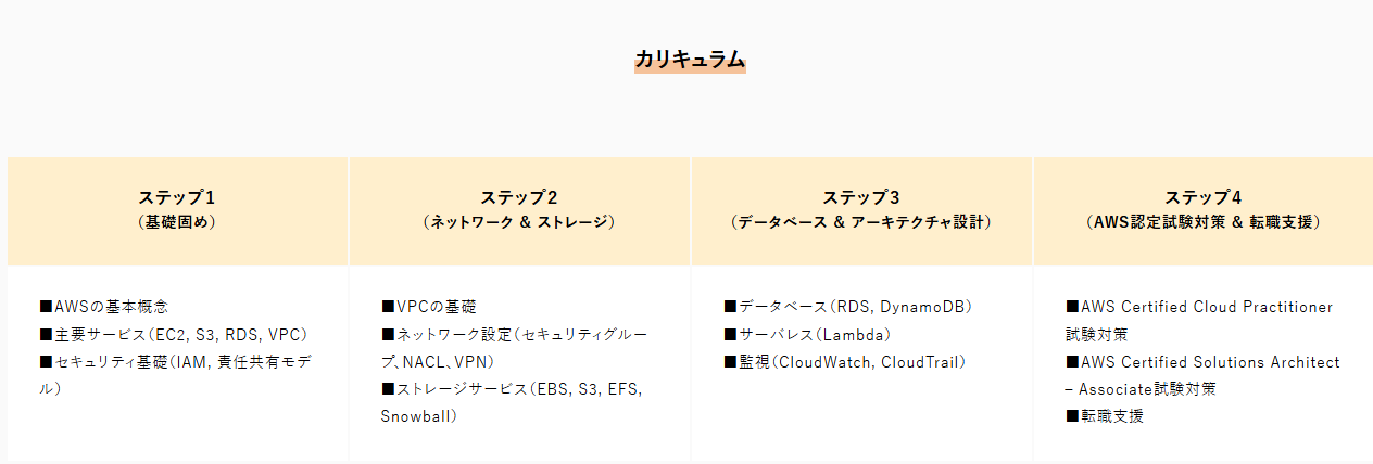 学習内容は、AWSの基本概念、インフラ設計、セキュリティなど、実務に直結するスキルを幅広くカバー。
