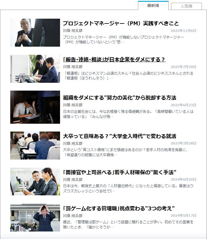 目次 掲載記事 2025年11月6日公開の東洋経済オンラインに、川畑が寄稿しました。 掲載記事 プロジェクトマネージャー(PM)任命はハズレくじ?”やりたくない”背景と実践すべき3つのこと ※東洋経済オンラインの寄稿記事一覧はこちら