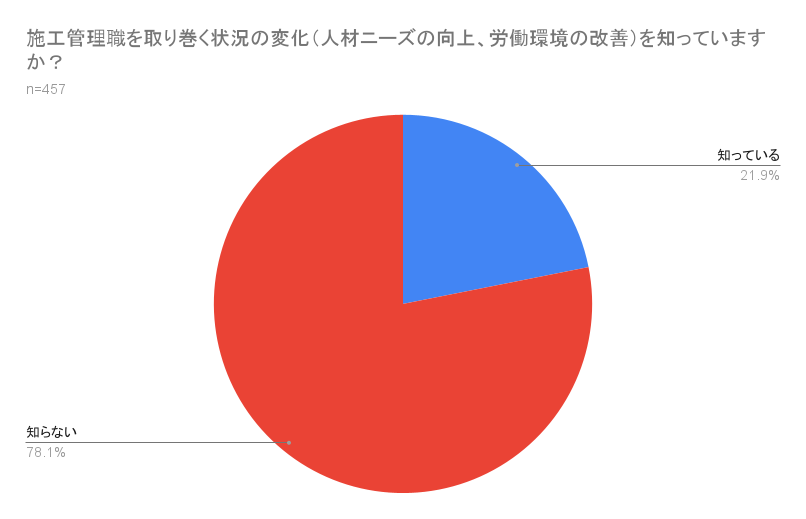 - 「施工管理職」の認知度は約7割に上るが、労働環境の改善等の「ポジティブな状況変化」を知っている割合は約2割にとどまった。